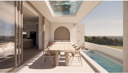 architectural elements, including a rooftop pool with a glass-bottom design, a waterfall down the wall into the jacuzzi. Surrounded by majestic palm trees,and scenic mountains. The villas feature Indonesian touch with extensive useof Indonesian wood in both the exterior and interior finishes. Located just 4 minutes drive from the pristine whitesands of Kuta Beach.